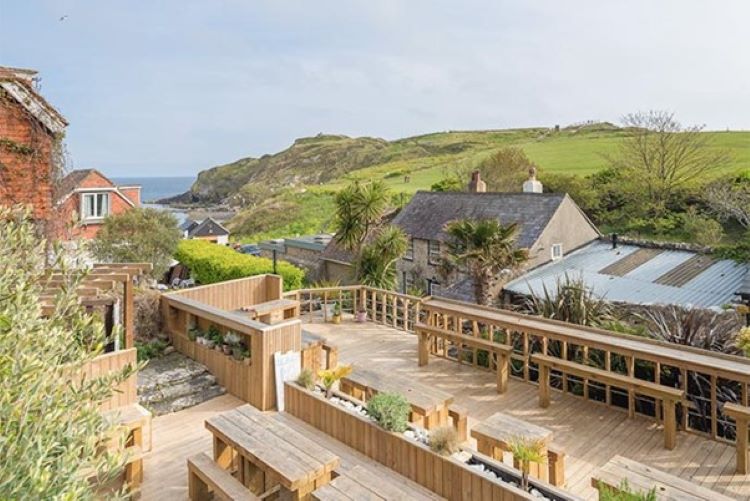 Genießen Sie bei wärmerem Wetter die Aussicht auf der Terrasse und genießen Sie nach dem Essen einen Spaziergang rund um das direkt nebenan gelegene Golden Cap Estate.